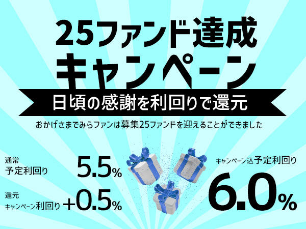 みらファンはおかげさまで25ファンドを募集するに至りました。これもひとえに投資家の皆様によるご支援の賜物です。