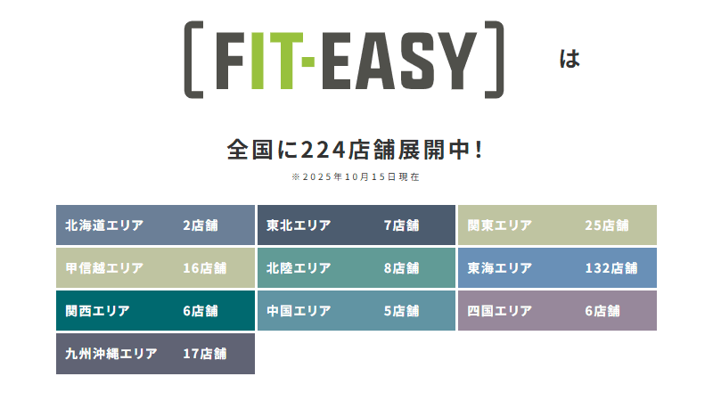2025/10/15時点でFIT-EASYの店舗数は全国で224店舗あり、会員数は2025/09段階で215,245人です。