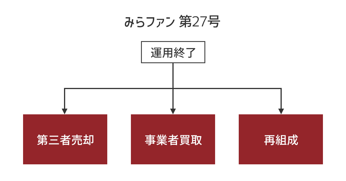 運用終了後の取り扱いは、第三者売却、事業者買取、再組成のいずれかを検討しております。