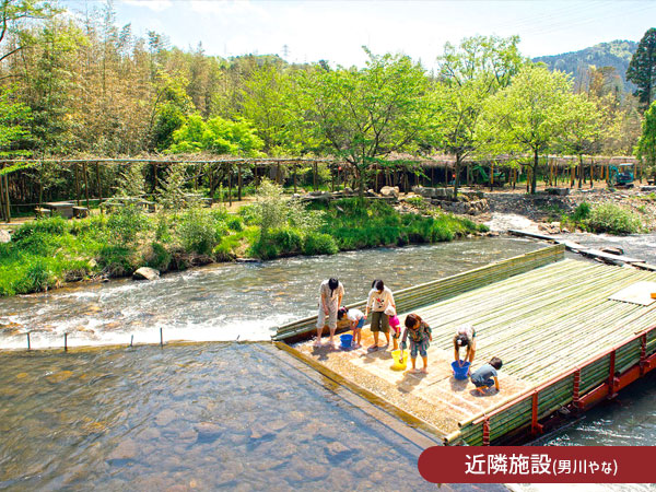 清流・男川(おとがわ)には観光やなが設置されています。設置夏季は鮎のつかみどりや塩焼き、バーベキューが楽しめます。薬膳料理や地元産のそばも名物で、川遊びとともに里山の味覚を満喫できるスポットです。