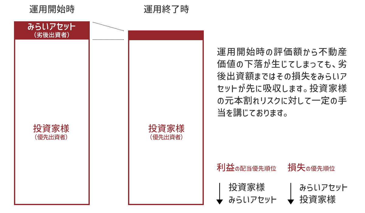そんな場合でも劣後出資額以内の下落(第27号の場合は事業総額の10.0%)であれば、みらファンが損失を吸収するため投資家様は安心して投資いただけるようになっています。