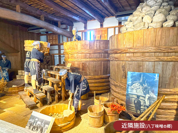 岡崎城から西へ八丁の地で、江戸初期から造られる豆味噌が有名です。大豆と塩のみを原料に、木桶に積み上げた約3トンの天然石を重石とし、二夏二冬(2年以上)熟成させる伝統製法が特徴。濃厚なコクと独特の風味があり、煮込んでも風味が飛びにくいという特徴があります。